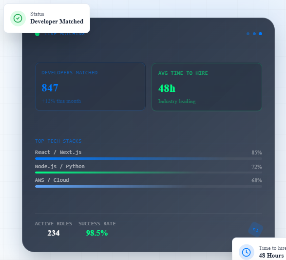 We pride ourselves on speed. After understanding your requirements, we can typically present you with vetted developer profiles within 48-72 hours. Once you make your selection, onboarding can be completed swiftly, often allowing your new team member to start within a week.